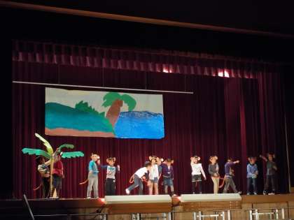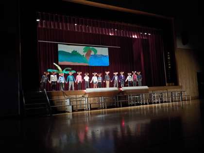 1年生のみんなと一緒に学習発表会の練習をしました。今日は大道具も設置し,衣装もつけて本番に近い状態で練習しました。少し緊張しましたが大きな声で台詞を言ったり,元気に歌を歌ったりすることができました。