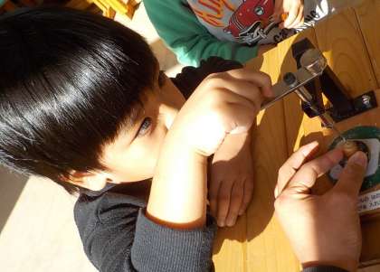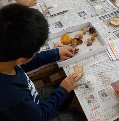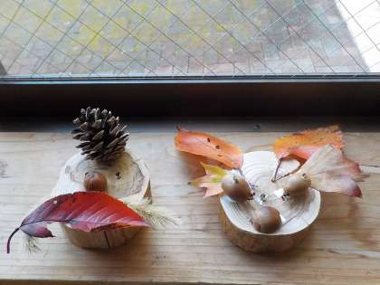 秋になってきれいに色づいた葉っぱやかわいいドングリを使って,コマを作ったり,動物の顔を作ったりしました。偶然の形を生かした愉快な作品に仕上がりました。