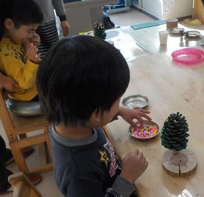 生活単元学習の時間に巨大松ぼっくりを使って,クリスマスツリーを作りました。パウダービーズなどの飾りをつけて,綿の雪も積もらせました。最後に雪だるまもつけて完成です。「本当の雪はいつ降るのかなあ」とつぶやきながら楽しく作ることができました。