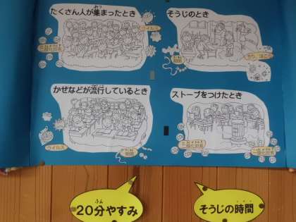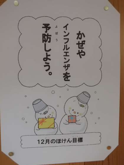 12月のほけん目標は,“かぜやインフルエンザを予防しよう”です。手洗い・うがいはもちろんのこと,空気の入れ替えなどもして,かぜやインフルエンザにかからないようにしましょう。
