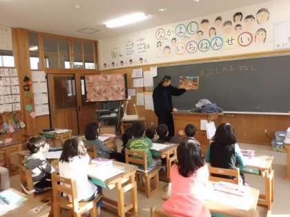今日は読み語りの日でした。“絵本大好き!京北お話の会”の小林先生に「十二支のおはなし」という本を読んでいただきました。読み終わった後も子どもたちは,「私たちはいのしし年だね。」「1月,2月,3月生まれの人はねずみ年!」と余韻に浸っていました。