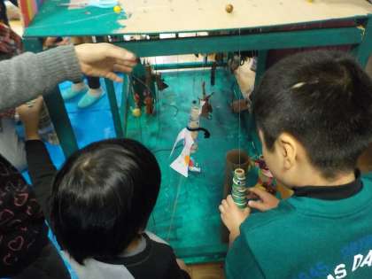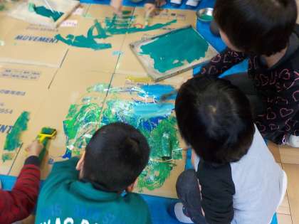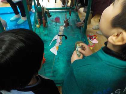 巨匠展の合同作品作りを広沢小学校で行いました。右京北支部の小学校の育成学級のお友達と一緒に「どきどきからくりいきものワールド」をつくりました。前回の続きで「いきものワールド」の周りの草むらづくりに挑戦しました。そのあとで,学校で作ったそれぞれの生き物を吊り下げていきました。自分の作った生き物がちゃんと動くか何度も確認していました。次回は作品を完成させみんなで遊ぶ予定です。