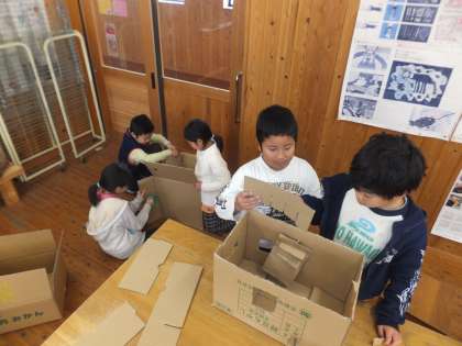 図画工作の時間に段ボールを組み合わせていく造形遊びをしました。