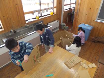 段ボールに切込みを入れてさしこんだり,穴を開けてさしこんだりといろいろな方法を見つけながら班で組み立てていきました。