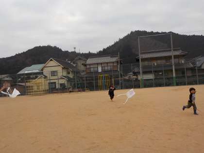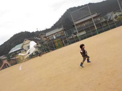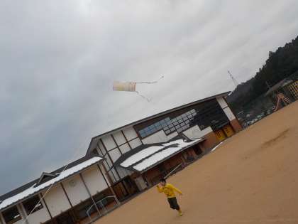 1年生が図画工作科の時間に作ったぐにゃぐにゃだこで休み時間に遊びました。速く走るとどんどん上がっていくたこを見て嬉しくなりました。