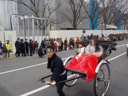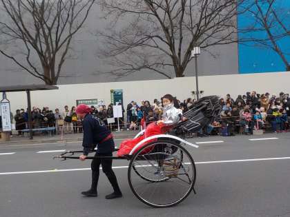 京都市消防出初式では,本校の1年生と6年生の児童が消防の図画で最優秀作品に選ばれ,市民パレードに参加しました。二人とも人力車に乗って沿道の方々に喜んでいただきました。