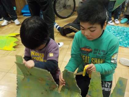 小さな巨匠展にむけて合同作品づくりをしました。今日は最後の仕上げで「いきものワールド」の周りの草むら作りをして作品を仕上げました。
