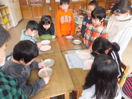 中間休みに豆つかみ大会の代表5名を決める予選をしました。