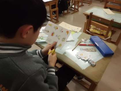 好きな食べ物の名前を尋ねたり,答えたりする学習です。今日は,それに使うカードの準備をしました。