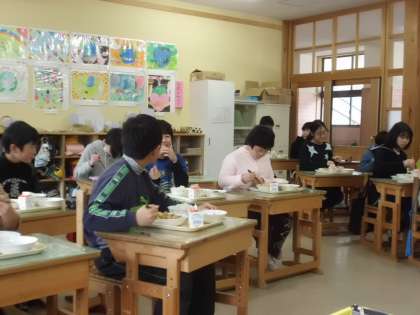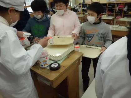 インフルエンザ等の流行を防ぐため,教室で給食をいただいています。ランチルームから教室まで給食を運ぶのは大変ですが,力を合わせて運び,配膳しています。
