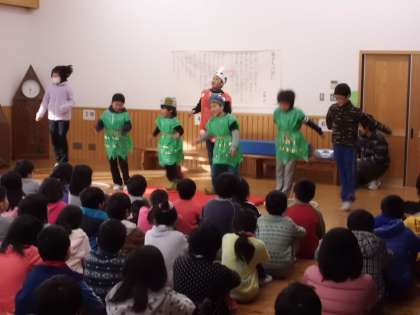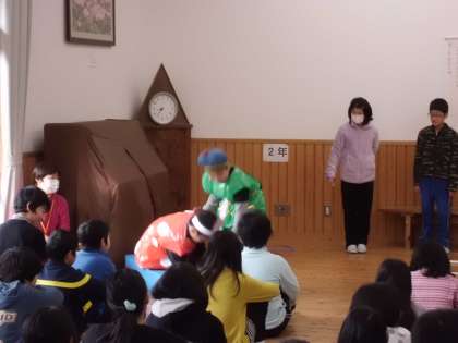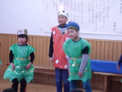 練習を重ねてきた「ウサギとカメ」の発表を朝会で行いました。全校のみんなの前に立つと少し緊張しましたが,手伝ってくれた友達のおかげで安心して表現できました。大きな声と動きで堂々と発表できたので,これからの学習にも生かしていければと思います。