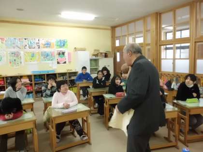 2月20日(金),斉田先生をゲストティチャーに迎え,化石のお話をしていただきました。宇宙誕生138億年前,地球誕生46年前・・・。海に住んでいた生物が進化し,陸上で生活。猿が人間に進化する過程について,興味深く教えていただきました。「アンモナイト」「恐竜の歯」「恐竜のウンコ」など,たくさんの化石にも実際に触れ,ずしりと重い化石に感動していました。