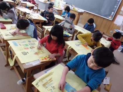 1年間の作品を入れるふくろに2年生での思い出の絵を描きました。♪あんなこと〜こんなこと〜あったでしょう!楽しかったよ2年生!!