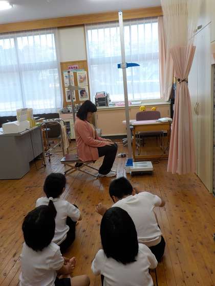 保健室で身体計測を行いました。お話をしっかり聞いて,身長と体重,座高を測ることができました。
