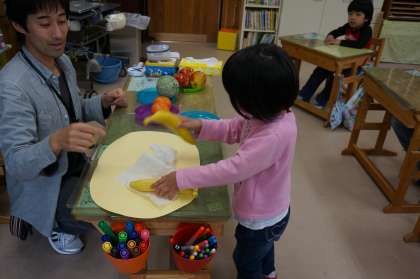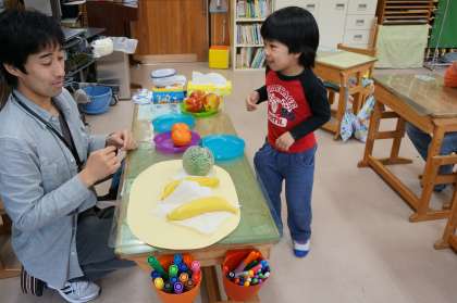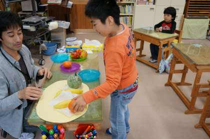 明日は京北第三小学校の大杉学級との交流学習で、クレープを作ります。数の勉強のときにその練習をしました。果物の数を言って、クレープにのせました。果物の数をしっかり数えることができました。明日うまく作れるかな?