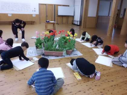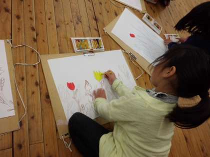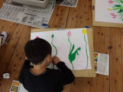 学校で育てているチューリップが満開になりました。チューリップの絵を描き,その中で友だちと楽しくあそんでいるところを表現しました。