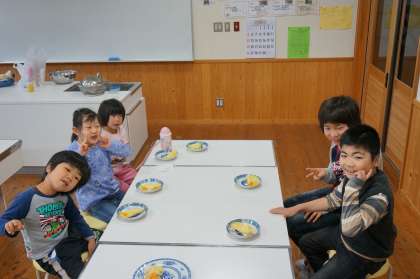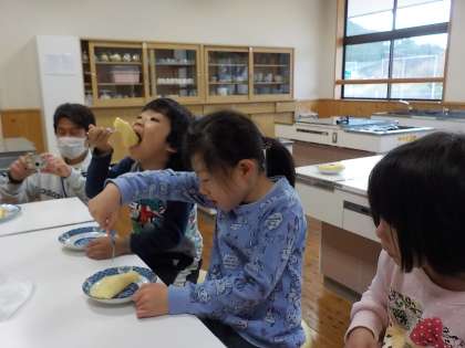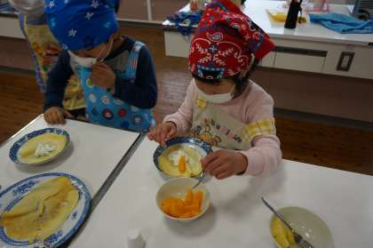 4月21日(火)は京北第三小学校のお友達と交流学習をしました。新しい仲間も増えたので、自己紹介をしました。そのあと、家庭科室でクレープを作りました。生地を混ぜて作って、焼いて、果物やクリームを乗せて巻きました。上手に盛り付けることができ、とってもおいしそうなクレープができました。あまくておいしくて、すぐに食べてしまいました。