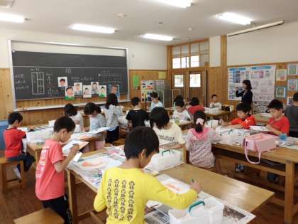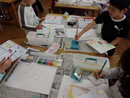 図画工作の時間に自分の顔を描いています。手鏡で自分の顔をよく観察しながら,彩色しました。