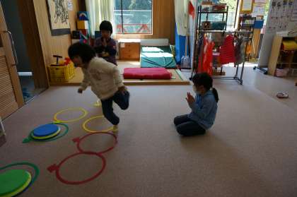 20分休みに、けんけんをして遊びました。自分たちで作ったコースをぴょんぴょん跳びははねました。そのあと、音の出るマットも置いて、音を鳴らしながら跳びました。音と一緒にリズミカルに跳ねて、楽しく遊びました。