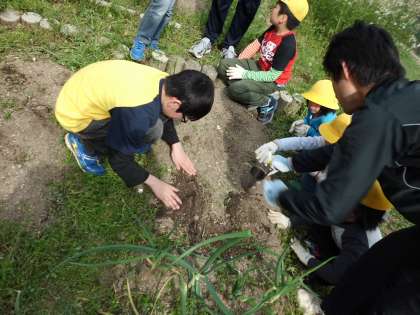 理科の学習のためにじゃがいもを育てます。いもが育ったら家庭科の調理実習でも使いたいなと思っています。今日は,ひかり学級の生活単元学習と合わせていっしょにたねいもを植えました。