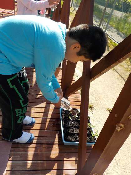 プランターとポットに植えたホウセンカ,キュウリの芽が出ました。これから毎朝の水やりをしっかり頑張っていきたいと思います。