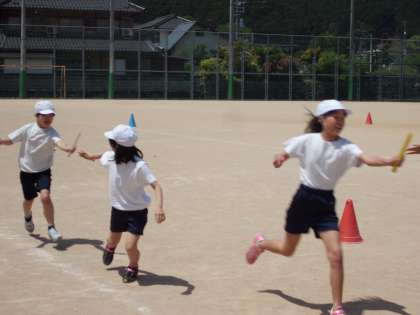 後ろを振り向かずにバトンをもらう,スピードにのってバトンをもらうという2つの事がだいぶできるようになってきました。