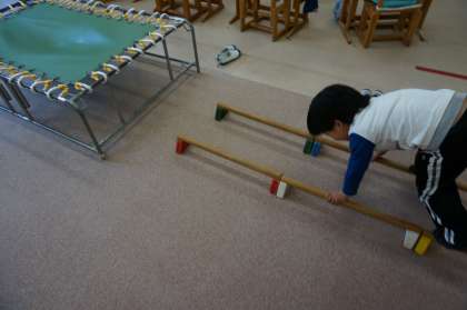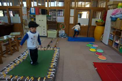 教室にあるトランポリンやマットなどで作ったコースで体を動かしました。腹筋をしたり、バランスに気をつけて歩いたりしました。楽しく体を強くできました。