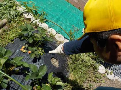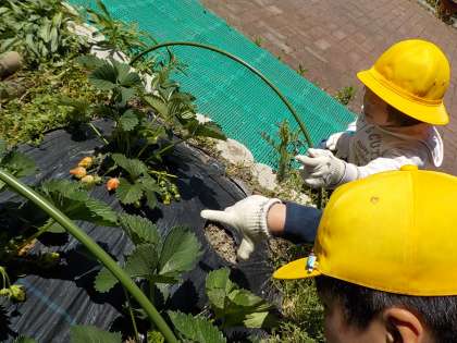 畑に植えていたイチゴが大きくなってきて、いよいよ赤くなってきました。とてもおいしそうです。早く食べたくなってきました。