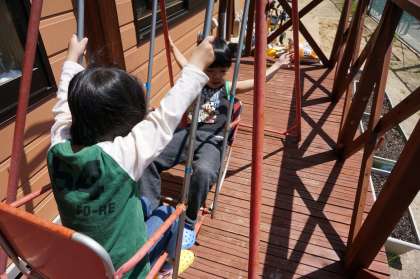 とってもいい天気。ブランコの椅子が加熱されていて、熱いくらいでした。2人でなかよく漕いだら、勢いがつきすぎて、少し怖かったようでした。