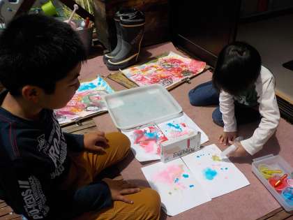 絵の具を使った表現に挑戦しました。霧吹きを使ったにじみの技法やトレイに絵具を浮かべるマーブリングの技法を楽しみました。出来上がった紙を使ってこれからどんな作品が出来上がるのか楽しみです。