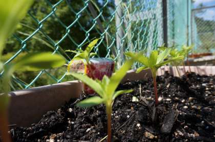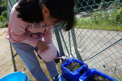 育てている野菜には毎日お水をあげています。アサガオが元気に大きくなってきました。ホウセンカも大きくなってきています。