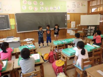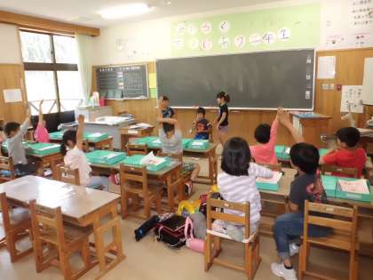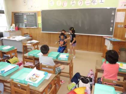 帰りの会でおたのしみがかりの3人がジェスチャーゲームやクイズをしました。正解した子には作った景品を渡し,みんな楽しく行いました。