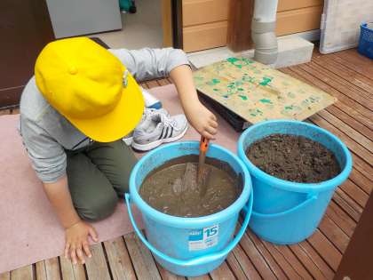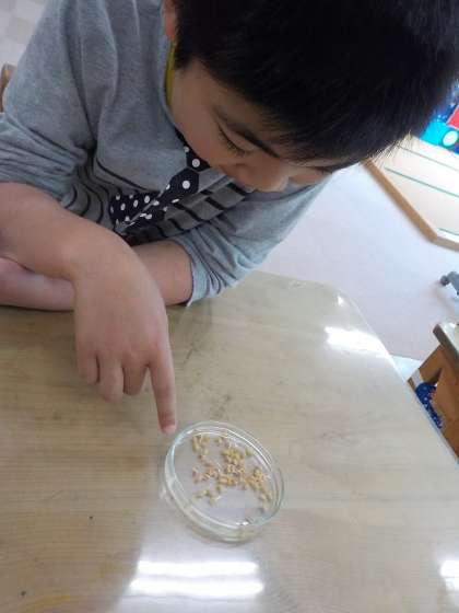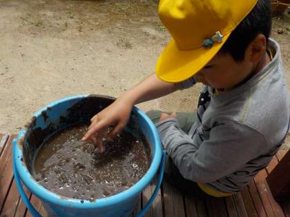 白い芽がでた種もみをバケツに植えました。「早く葉が出てくるといいなあ。おししいお米ができるといいなあ。」といいながら丁寧に植えました。