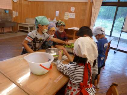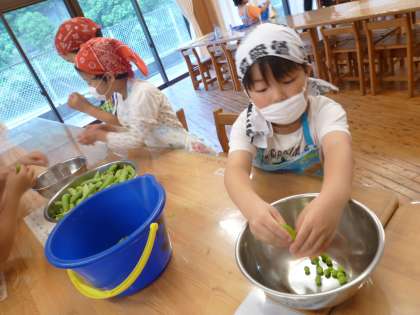 明日の給食は“朴葉ごはん”です。その材料となるえんどう豆の皮を,1年生とひかり学級の子どもたちがむきました。はじめは,なかなか上手にむけませんでしたが,回数を重ねるごとに,速くきれいにむけるようになっていました。明日の給食が楽しみですね。