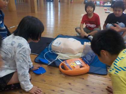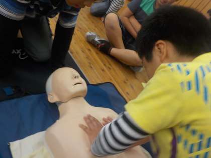 消防署の方に来ていただき,救急救命入門コースを実施しました。心臓マッサージの仕方とAEDの使い方について教えていただき,実際に練習しました。