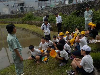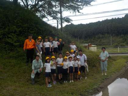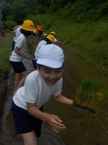 6月9日に田植えをしました。JAの方に指導していただき,学校よりも広い田んぼにみんなで丁寧に植えました。