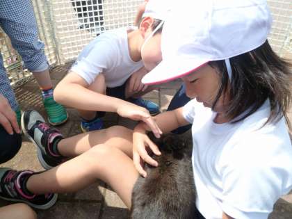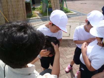 生活科で「いきものとなかよし」の学習に取り組んでいます。今日は,ウサギのライチとなかよくなれるようになでたり,抱いたりしました。