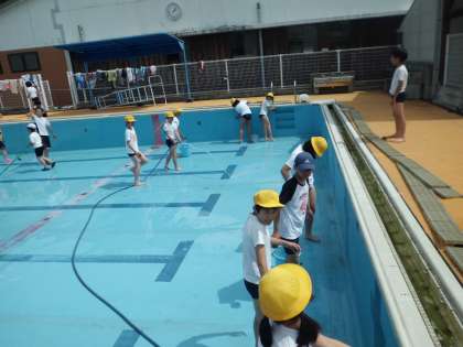 水泳学習に向けて5・6年生がプール清掃を行いました。5年生はプールの外回りをきれいにし,6年生はたわしを使ってプール内の汚れを落としました。ピカピカのプールで準備OKです。