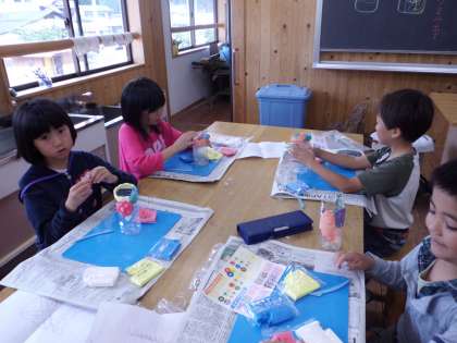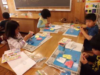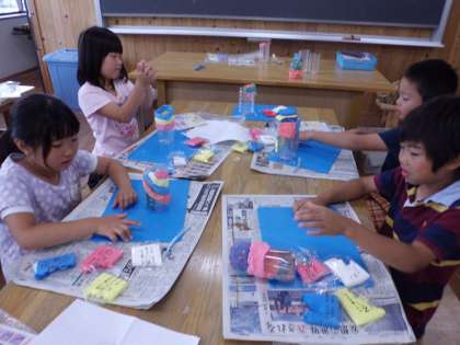 紙粘土を使って,ペン立てをつくりました。粘土を混ぜ合わせたくさんの色をつくって,かざりつけていました。