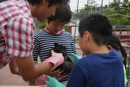 ウサギのライチと触れ合いました。ひかり学級の飼育委員さんが大杉学級の友達にライチを抱かせてあげました。ふさふさでした。