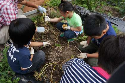 そのあと,ジャガイモの収穫をしました。土を掘ると次から次へと大小さまざまな大きさのジャガイモを収穫できました。ミミズやダンゴムシもたくさん出てきて,びっくりしていました。