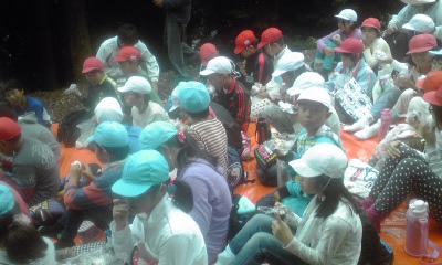 ブルーシートで全員座っておにぎりの昼食。昼食後は杉の探検です。