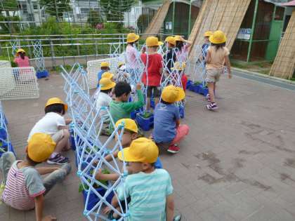 アサガオがどんどん大きくなってきています。「葉っぱの形が最初と違っている!」「葉っぱが増えているね。」と,子どもたちも成長を喜んでいます。今日は,みんなで支柱を立てて,アサガオのつるが巻きつくようにしました。
