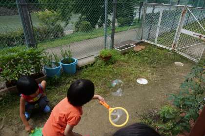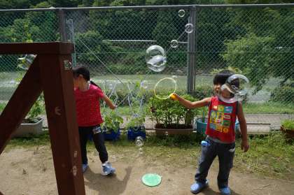 休み時間にシャボン玉で遊びました。大きい○を使うと,大きなシャボン玉ができたり,○がたくさんついた棒を使うと,たくさんシャボン玉ができました。とてもたのしかったです。