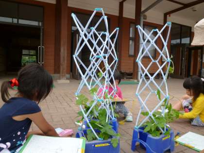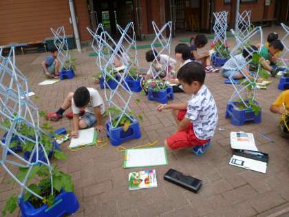 生活科で育てているアサガオの観察をしました。葉っぱが大きくなり,つるもぐんぐんのびています。「さわるととげとげしていたよ。」「前よりも葉っぱが大きくなってきた。」といろいろな発見をしていました。