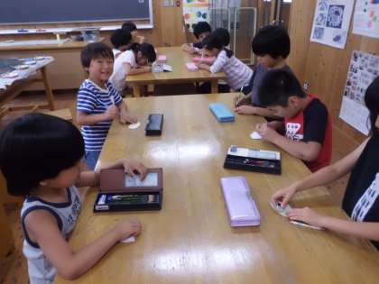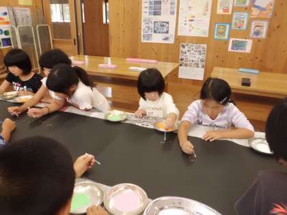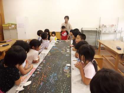 今日は七夕ということで織姫と彦星の間に天の川を描きました。綿棒に絵の具をつけて,ポンポンと叩きました。最後に自分の願いを短冊に書き,楽しく活動することができました。