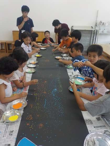 2年生と交流学習をしました。七夕にちなんで,綿棒を使ってスタンピングして天の川を一緒に作りました。使いたい色を交換したり,友達のよいところをお話しながら楽しく描くことができました。