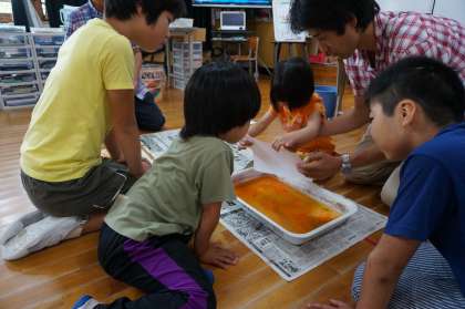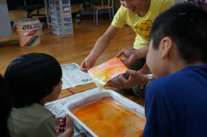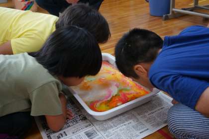 まず,図画工作ではマーブリングをしました。いろいろな色を桶に垂らして,みんなで力を合わせて,ふーふーしました。紙をそーっと置いてみると,きれいな模様がつきました。自分が待っているときでも,「この色すごくきれい!」と感じながら見ていました。きれいにできた作品は持って帰りました。早く使いたいですね。