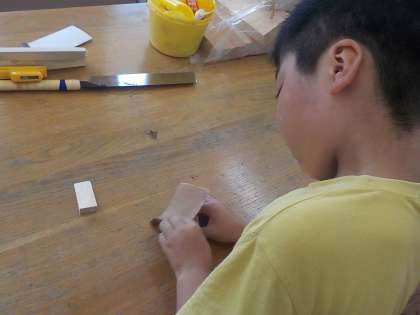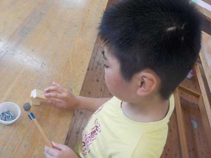 手芸工作クラブで,木を使った工作に挑戦しました。のこぎりやかなづちを使ってカエルを作りました。