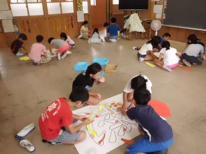 画用紙を組み合わせながら,大きな文字をみんなで作っています。